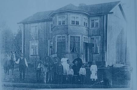 Johan Erik Jakobson Södergård med familj och stuga på Svartholmen. "Svartholms Johanerik" i Kärklax. Johan Erik står längst till vänster, Han är född 1879 på Södergård i Vassor och döpt i Maxmo. Jan var gift med Beata Kagg f. 1874 i Maxmo.