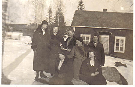 Framför Bagarstugan på skolbacken. Stående fr. v.: 1. Wivi Östman g. Kultti, 2.Elvi Norrgård g. Mattlin, 3. Signe Lundberg g. Rosvik, 4. Ester Frantz. Sittande fr. v. 5. Vera Ivars g. Dahlberg, 6. Berta Lundberg g. Österblad, 7. Ingrid Östman g. Åberg (sitter)