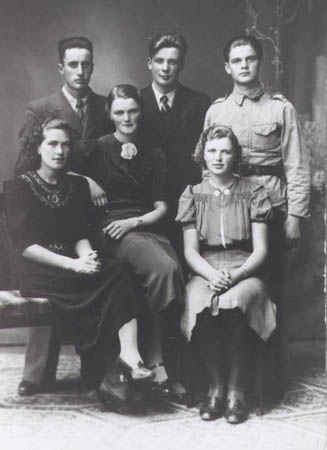 Kuniungdomar 1940-talet. Sittande: Elna Örn g. Forsman, Anni Rådman, Sally Rådman g. Lassus. Stående: Ragnar Studd, Bertel Södergård, Elis Rådman.