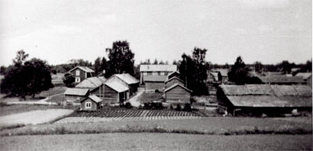 Nybergs (Aittamäki) gård med gaveln mot vägen och Nygols (Wik) gård med långsidan mot vägen. Uppibyn