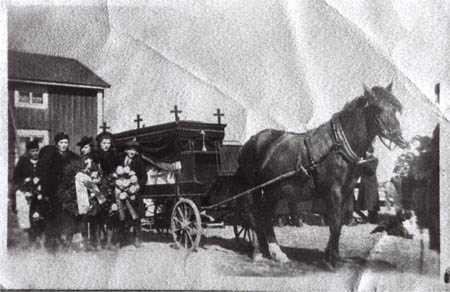 Begravning vid Storbacka 1943. Soldat Evert Valdemar Storbacka dog i tbc i Kronoby 10.4.43 och begrovs på Fridhem begravningsplats. Fr. v. Ester Frantz, Betty Storbacka, Signhild Storbacka, Elin Storbacka och Fridolf Storbacka. Vassor bys likvagn. Soldater Soldat