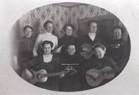 Ett frikyrkligt strängband från ca 1920. Sittande från vänster: 1. Edla Rabb ”Nyyoåkäs Iedla”, 2. Maria Viklund, g. Udd, 3. Maria Wik ”Nyygols Marii”. Stående från vänster: 4. Edla Udd, Anders Udds dotter, 5. Katarina Wik, 6. Ida Wik g. Svarvar, 7 Edla Wickström och 8. Hanna Wik g. Wasberg.