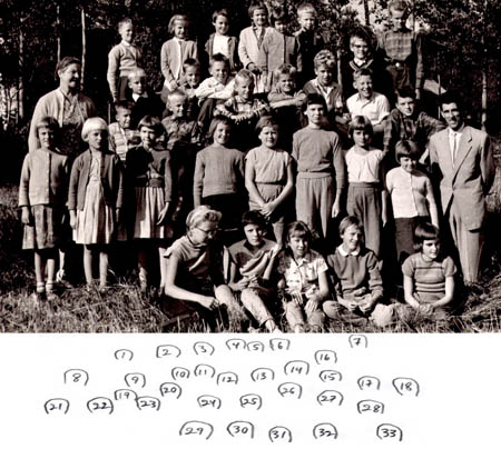 Vassor folkskola 1959-60. 1. Bengt Enroth 2. Birgit Åman 3. Myrtle Frantz 4. Marianne Wiik 5. Kerstin Östman 6. Gert Norrgran 7. Kaj Öman 8. Ellen Berg, lärarinna 9. Kjell Hinders 10. Henrik Örn 11. Alf-Gunnar Wasberg 12. Alf Hellman 3. Per-Erik Öman 14. Lars Örn 15. Håkan Lundberg 16. Dan Skog 17. Krister Frantz 18. Bror Siegfrids, lärare 19. Göte Öman 20. Göran Öman 21. Gunvor Pada 22. Gretel Hinders 23. Berit Wallén 24. Kristina Örn 25. Gun Lis Nyqvist 26. Elisabeth Wasberg 27. Lisen Heir 28. Lisa Örn 29. Doris Strandberg 30. Inger Vasberg 31. Sonja Wallén 32. Anita Enroth 33. Eivor Åberg
