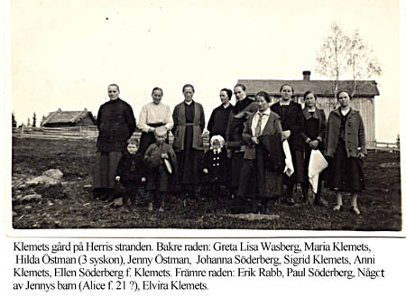 Klemets på Herris stranden. Bakre raden från vänster: 1. Greta Lisa Wasberg f. Östman. 2. Maria Klemets f. Östman. 3. Hilda Östman. 4. Jenny Östman f. Fors. 5. Johanna Söderberg f. Östman. 6. Sigrid Klemets. 7. Anni Klemets. 8.Ellen Söderberg f. Klemets. Främre raden fr. v. 9. Erik Rabb. 10. Paul Söderberg. 11. Något av Jennys barn. 12. Elvira Klemets f. 1896 i Amerika. Text i bilden.