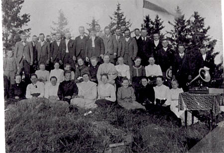 Ungdomar med vimpel i topp. Stående fr. h. 3. Jakob Östman. 9. Gustav Östman. 13 Edvard Wik. 18. Alfred Örn. Sittande främre från höger: 2. Edla Örn gift Örnberg. 3. Maria Örn gift Beijar. 6. Greta Lisa Södergård gift Nykvist. 7. Anna Wickström. 8. Maria Wik. Sittande bakre fr. h. 2 Anna Lisa Örn gift Östman. 3. Hanna Wasberg. 4. Maria Wasberg 5. Johanna Östman gift Frantz. Ungdomssamling i seklets början. Grammofonen till höger stod för underhållningen.