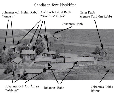 Flygfotografi över Sandåsen före Nyskiftet. Bilden visar byggnadernas ägare. Johanns Rabb, Ingrid Rabb, Johannes Åman, Ester Rabb och Torbjörn Rabb.