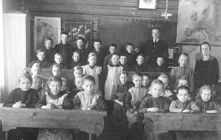 Elever i Kuni folkskola 1927. Lärare Otto Granér och Sigrid Nyman. Sigrid utdimitterades som lärare 1925. Mitt i bild med mörk blus sitter Linnéa Wahlström g Ahlskog, andra från höger i första raden sitter Hulda Finne g. Nylund och till höger om henne systern Ida Finne.