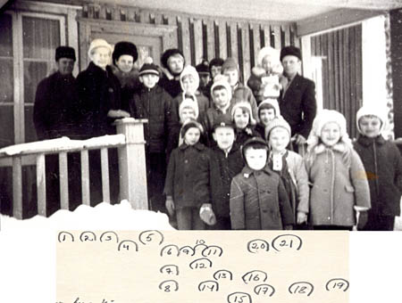 Söndagsskola på Ånäset. Söndagsskola hos fam. Edvin Vestergård (f.d. Arvid Storbackas gård) på Ånäset ca 1966. 1. Oskar Öman 2. Anni Klemets 3. Elin Öman, lärare 4. Ole Åberg 5. Gretel Hinders g. Mantere 6. Kristina Wik 7. Harriet Forsell 8. Klas Öman 9. Göte Öman 10. ? 11. Ann-Marie Forsell 12. Carita Åberg g. Antell 13. Greta Örnberg g. Wiklund 14. Hans Örnberg 15. Bjarne Wiik 16. Barbro Wiik 17. Inga-Lill Vestergård 18. Helena Hinders g. Östman 19. Göran Öman 20. Helena Svarvar 21. Robert Östman.