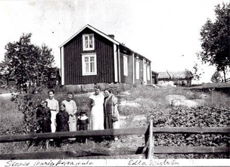 Wickströms stuga. Fr. v. Sigrid Åberg, Maria Åberg, Agda Åberg g. Östman, Julia (Lula) Wickström f. Bergsten, Hildur Åberg g. Mälsor, Edla Wickström och Elin Bergsten (Julias syster).