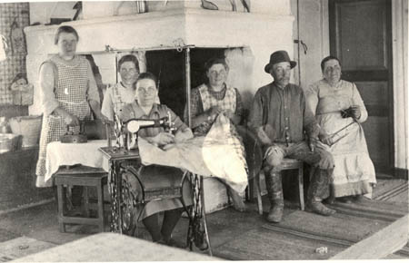Familjen Herman och Johanna Hinders samlad framför råspisen vid Båskas i flitens tecken år 1930. Från vänster: 1. Ida Hinders g. Nyman, stryker kläder. 2. Edit Hinders 3. Maria Hinders, sömmerskan vid symaskinen. 4. Signe Hinders g. Nässlin, broderar. 5. Herman Hinders 6. Johanna Hinders f. Storbacka, sitter med sticksömmen.