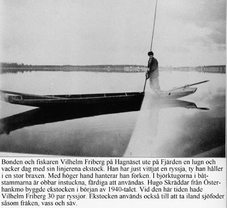 Bonden och fiskaren Vilhelm Friberg med ökstock. I vänstra handen håller han en braxen och i högra en fork. Text finns i bilden.