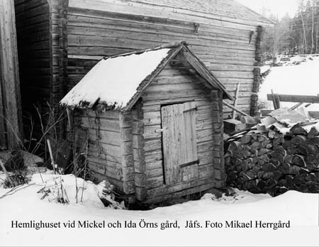 Timrat ”skithus” i Vassor, vid Jåfs (Avträdet på Mickel Örns och Ida Örns gård med inskription 1899)