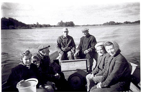 Motorbåtsutflykt i Kyro älv. Från vänster: 1. Marita Mälsor. 2. Rigmor Wasberg. 3. Emil Wasberg. 4. Robert Mälsor. 5. Verner Rönnberg, båtens ägare. 6. Hildur Mälsor f. Åberg. 7. Gertrud Wasberg g. Friberg.