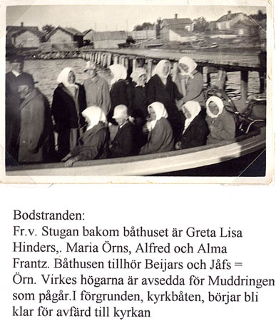 Kyrkbåten klar för avfärd till kyrkan fr. v. båtens ägare Isak Wasberg, Jakob Rabb, + 10 okände damer, längst till höger Irene Rabb. Text i bilden.