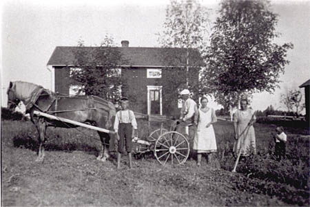 ”Hagastugos” Jarl Nyman, Edvin Nyman, Edit Hinders, Ida Nyman och Bengt Nyman runt slåmaskin. En del av Ivars vid delning.