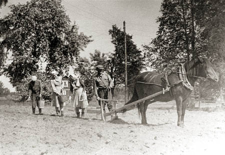 Potatissättning på Nytomt. Från vänster Bertel Wik, Alli Wik g. Petersson, Saga Wik g. Örnberg och Albert Wik. Våren 1950. Hästen är Brunin. I bakgrunden Edvin Strandbergs stuga.