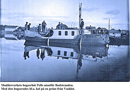 Bogserbåten Pelle, förtöjd vid bryggan på Bodstranden. Pelle servade mudderverket med personal och bränsle. På fotot ses längst till vänster ett brädmagasin tillhörande muddringsföretaget. I höger bildkant syns ett plank, som kringgärdar kolförrådet. Av stugorna på Bodstranden höjer sig Skräddar-Marias stuga högt över Pelle. Båskas Lisas stuga ser man taket av till höger om Pelles mast.
