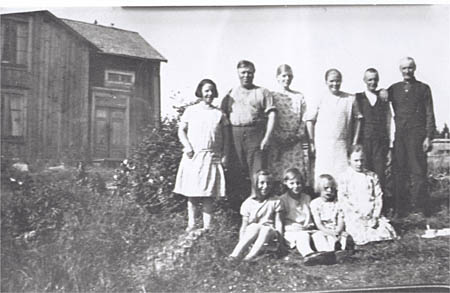 Fam. Alfred Frantz och Lepistö m.fl. Utibyn. Stående: Lepistö (på mudderverket), Elna Wik, Aina Frantz, Isak Storbacka. Sittande: Flicka från Backas, Edna Frantz, Elvi Frantz och Sigrid Nyman. Huset torde vara Garveristugan där Frantz bodde på 1930-talet.