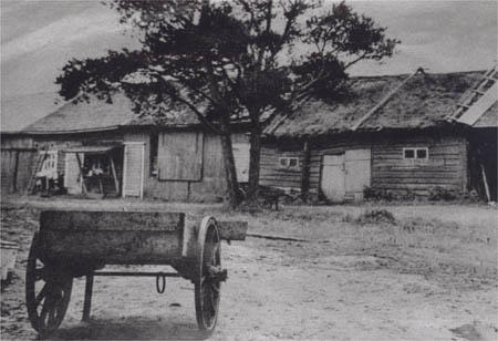 Johannes Rabbs g. med Helmi f. Åström uthusrad. De delade på uthusraden på Sandåsen. Edla och Irene Rabbs fähus (syskon) hade ännu torvtak.