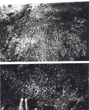 Hällristning på Klockarhällan i Kullomossen utförda av kobaggarna. A V 1926 kan betyda Arne Wik f. 1911 eller brodern Artur. A I kan betyda Alfred Ivars f. 1895. E. S. 1926 betyder troligen Evert Sandén f. 1911