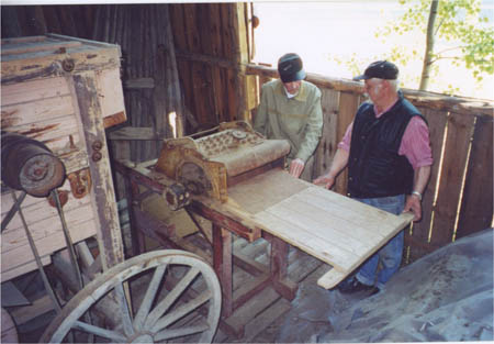 Berndt Nygård i Västerhankmo visar upp ett stifttröskverk som han köpt i Pudimo. Tröskverket var handdrivet men har försetts med en remskiva så att det kunde drivas från en båtmotor. Det slog enbart sönder axen utan att sortera bort säd, agnar och halm. Sanfrid Hinders till vänster betraktar tröskverket. Två bilder finns. Se VBH IV s. 287.