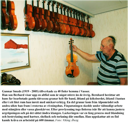 Bernhard Smeds visar sin fars, Gunnar Smeds, fioler som får representera ett skickligt hantverk. Text finns i bilden.