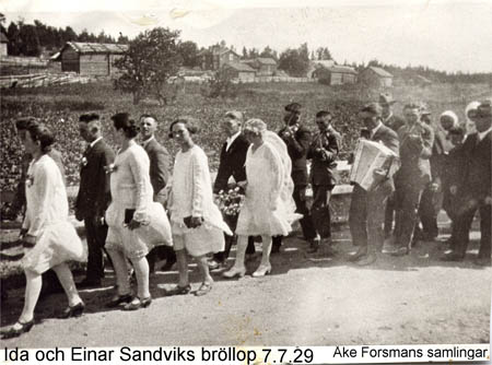 Ida Forsman och Einar Sandviks och Edit Forsman och Lennart Sandviks bröllop i Kuni 7.7.29 (dubbelbröllop mellan två syskonpar). Brudföljet på väg till Marthagården. I följet syns också Karl Nymark och Elna Nymark och efter dem går Arvid Forsén och Aina Forsén. I bakgrunden Laggen , Ribackgårdarna och Sandhedsvägen.