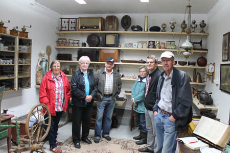Historiekommittén besöker Åke Forsmans samlingar. Siv Wik, Annel West, Åke Forsman, Gunvor Svarvar, Kjell Herberts och Alf-Göran Näsman.