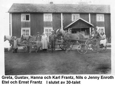 Smedis mangård: Greta Frantz, Gustav Frantz, Hanna Frantz, Karl Frantz, Nils Enroth, Jenny Enroth, Etel Frantz, Ernst Frantz. I slutet av 30-talet.