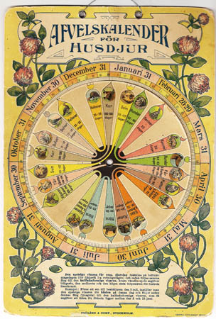 Avelskalender för gårdens husdjur. Med den beräknas tiden från befruktning till nedkomst.