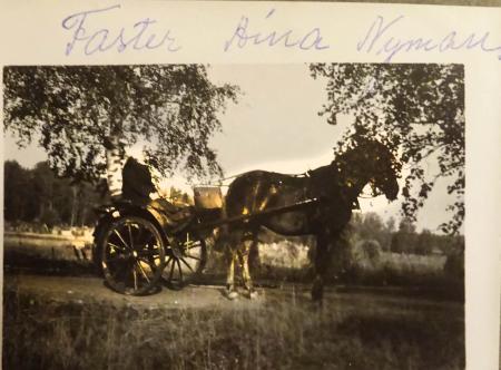 Aina Nyman f. Kuni 1879 på linjalkärra i Kuni.