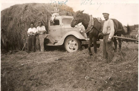 Sanfrid Beijar med ett hölass på sin lastbil (eller brodern Evalds bil). Till vänster om Sanfrid Jarl Udd och till höger Anders Beijar med hästen för höräfsan. På biltaket sitter Ingegärd Beijar g. Enroth.