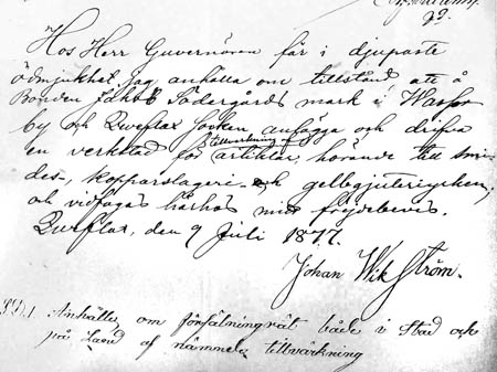 Johan Wikströms (Wickström) anhållan om att få bygga smedja på grannens mark. Smedjan står diagonalt över rån.