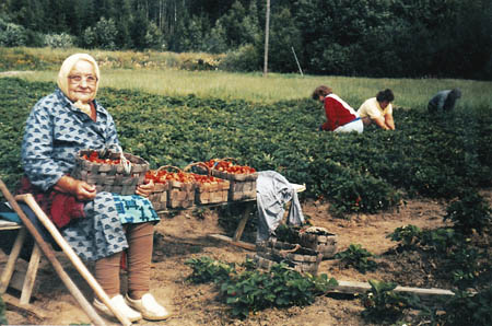 Elsie Rabb i sitt jordgubbsland tillsammans med plockare: Sirkka Rabb, Gunvi Småros f. Rabb