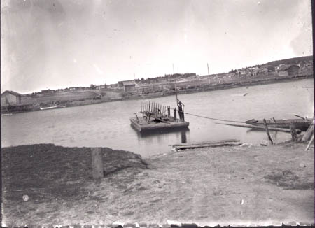 Den första färjan (pråmen) över Kyro älv i Kvevlax ca 1902. Färjkarlen heter Fredrik Sandnäs "Steina Fredrik". På andra sidan älven står färjkarlens stuga. Längst till vänster Herrgårds husen. Följande, den ljusa stugan, är Lappas senare Abraham Ahlskogs hus. Bonäsöurin är följande och bränneriet ett stort hus till vänster om färjkarlens hus. Kyrkan syns i mitten. På Skatan finns Brita Mälsors hus, gift Hurr. Längst till höger Arvid Klemetsös byggnader. Uppgifter Yngve Svarvar.