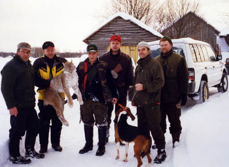 Från vänster: Stig Kastus, Leif Örn, Mika Harjula som sköt lon, Per-Johan Örn, Bengt Sandström från Österhankmo och Peter Kastus. Vallvik, Vassor och Hankmo jaktklubbar jagade lodjur tillsammans i många år. Lon, som sköts i Voitby 17 januari 2003, vägde 14,5 kg.