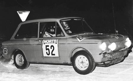 Anders Forsman och kartläsaren Ralf Jakobsson passerar "Flinkfeltas kurvon" i Österbottniska rallyt 1976 med Sunbeam 900. Sport och idrott