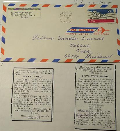 Vendla Smeds och hennes fars Mickels Smeds och hennes mors Brita Stina Smeds dödsannons i tidningen. Ett Amerikakuvert från 1975.