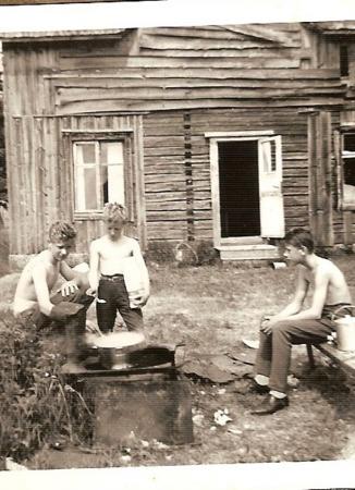 Matlagning på Hästholmen. Lars Öhrn, Alf Hellman och Bernhard Smeds. Stugan tillhörde Sanfrid Hinders som hyrde ut den under en kort tid. Holmen med stuga skiftades till Sanfrids äldsta syster Maria Irene ( f. 1897) som fick lösa in den från skolhemmanet Hinders. Stället var ett vanligt utfärdsmål för Vassorborna. Holmen är numera ihopvuxen med Bonässkatan. Tidigare fanns där naturängar som gav gott om sjöfoder åt djuren.