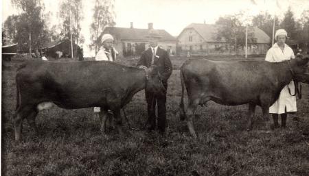Lantbruksutställning i Gamla Vasa 1934. Personerna är Märta Södergård, Johannes Kuni och Alida Forsman.