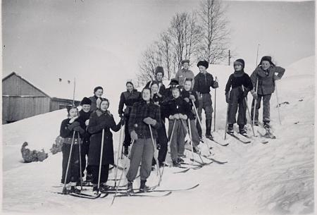 Kuniungdomar på skidutflykt till Märkenkall. Året är ca 1944–1945. Kuni skolas elever födda under första halvan och mitten av 1930-talet. Följande torde kunna kännas igen: Rut Klemets, Alice Kuni (identifierat de flesta), Elly Berg, Gunvor Berg, Margit Studd, Ragni Kuni, Väinö Koivisto, Olof Willför, Ruben Studd, Alf Forsén, Lars-Erik Pörn och Elvi Wasberg, tredje från höger med svart mössa är Rune eller Sanfrid Forsman. Ett par deltagare var äldre, kanske förälder eller lärare.