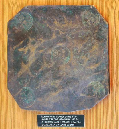 "Detta kopparmynt hittades jämte fyra andra år 1930 vid dikesgrävning på Anders Beijars mark i Vassor by. Detta mynt gavs som gåva av Evald Beijar vid invigningen av sparbankens nybyggda huvudkontor 1951." (Anteckning på plaketten som myntet är fäst vid.) Plåtmyntet var 4 daler silvermynt med årtalet 17xx. De två sista siffrorna i myntet är svårlästa, men kan vara 39.