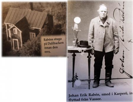 Johan Erik Rabén (född Mariasson 1847, död 1926) var smed i Karperö och gift med Katarina Isaksdotter Norrgård. Johan Erik lärade sig smedyrket hos sin styvfar Isak Rabin i Vassor (f. 1819 Östman/Bjynis och gift men Maria Eriksdotter Näsman). Isak var bysmed i Vassor från 1849 på bysmedens torp nedanför Laggen. Då sonen Isak döps i Maxmo 1859 benämns han "Sockensmed". Vassor byamän var missnöjda med Isaks arbete och ville få bort honom från torpet, men Isak var bra att förklara sig. Bysmedens son Isak Isaksson körde med oxe till sina ägor, bl.a till Kåtakärr dit han körde genvägen över bergen i Bastuholmen därav benämningen ”Smeda Isakas järnvägen”. Det var i den miljön Johan Erik Rabén (bilden) växte upp.