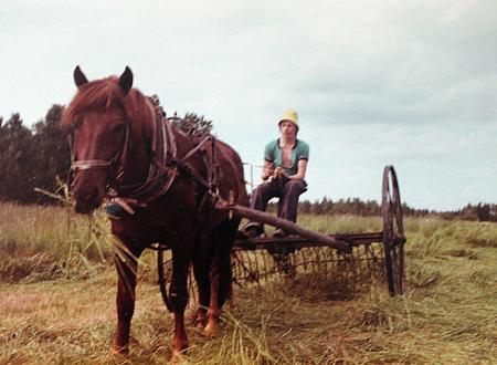 Höbärgning. Sören Östman räfsar ihop torrhö med Erilus som dragare. Platsen är Stensund.