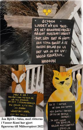 Figurer i Mälsorspåret 2022. Åsa Björk i Såka har gjort figurerna. Andra som varit med i spårtalkot är Tore Norrgård, Bo Beijar, Johan Wasberg (Vallvik), Janne Näse och Oskar Sjölund. Mälsorspåret är 8 km med start och parkering vid Rönnvik HF, Rönnvikvägen 69.