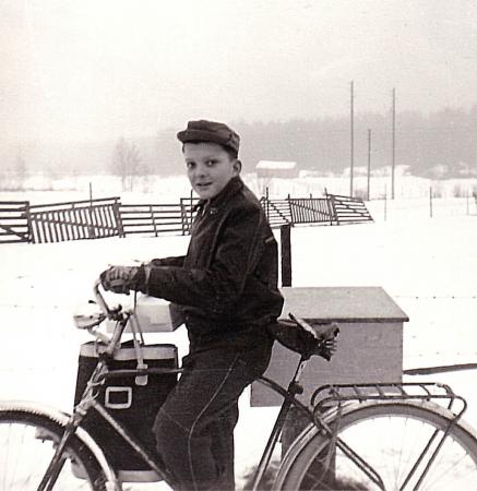 Krister Frantz på jullov i Vassor året efter att familjen flyttat till Sverige. Familjen bodde på "Öirin". Lägg märke till snöhindren som sattes upp för att fånga upp drivsnön. I bakgrunden området mellan Brinkbacken och Pikkubacken. Ladan tillhörde Oskar Öman.