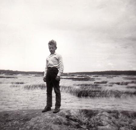 På Hästholmen står Alf Hellman på strandhällan. i bakgrunden Vassorfjärden som den tiden hade rätt stora öppna ytor. Läs mera...