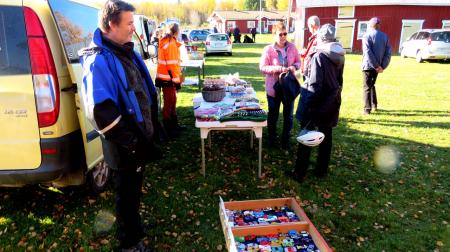 Vassor Marthaförenings höstmarknad 8.10.22. Närmast kameran Pontus Westerholm med sin samling bilar. Marita och Dan Jakobsson, Monica Ek med ryggen mot kameran säljer bl.a. ekologiska ägg, olika köttprodukter och stickade sockor.