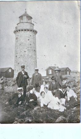 Utfärd till Holmögadd i augusti 1917. Längst t.v. fyrmästare Sjöstedt och längst till höger hans dotter Astrid. Halvsittande med hatt är Johannrs Björkman f. Wik och Edvard Wik,