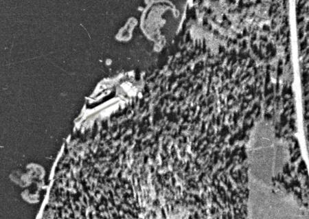 Detalj, klippt ur en flygbild från 1950, som visar Teodor Forsells och Ernst Frantz såg med en lastbåt vid sågen.